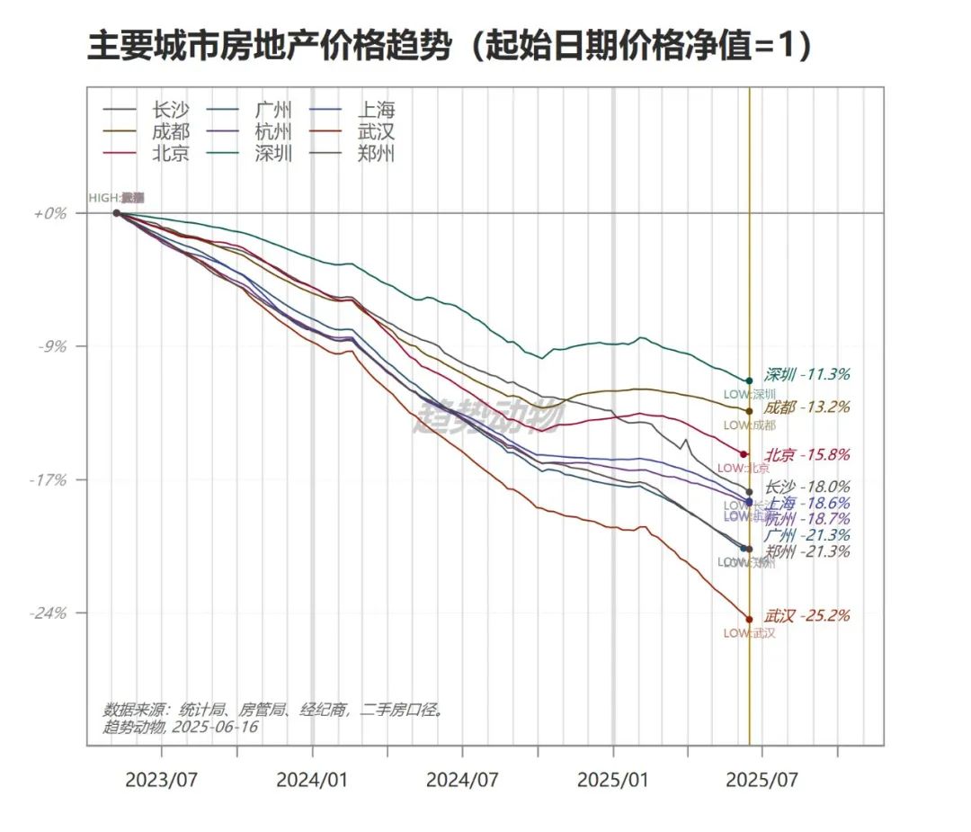只看环比和同比表格数据可能不够直观,我转发一张趋势动物小程序里全国9大城市过去24个月房价走势,你们可以看的更清楚。