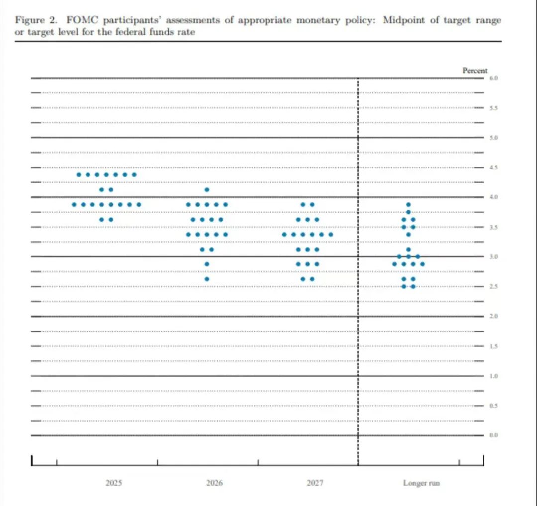 附最新的利率点阵图,横轴是时间,竖轴是利率,19个点代表19个委员。