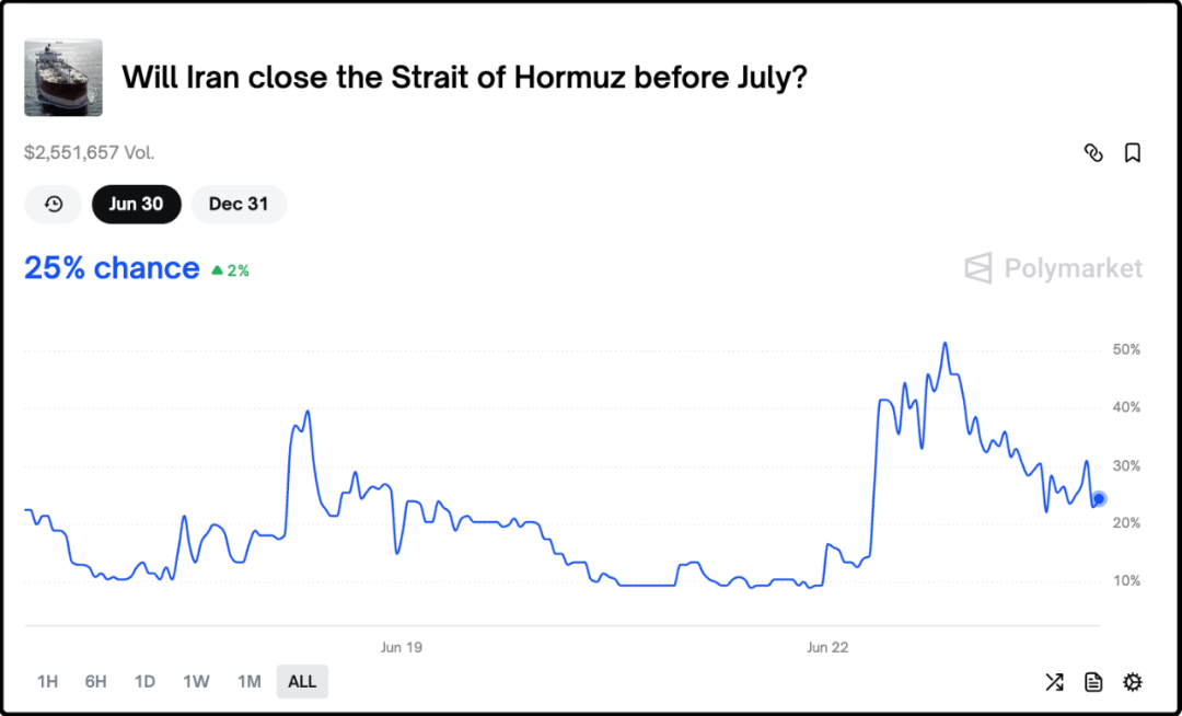 表现第三的是油气开采板块,+3.2%,这个其实是高开低走了,收了个阴线。伊朗封锁霍尔木兹海峡的声势令石油市场担忧,但最终他们真的有没有决心封锁不好说,我去看了菠菜网站的下注,认为伊朗在7月份之前会封锁霍尔木兹海峡的概率有过震荡,最新只有25%,不是很高,所以很可能虚晃一枪,油价后面还是会回落的。