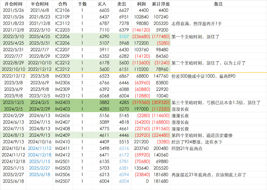 哦对了,今天在集思录看到一张图觉得很有意思,一定要和你们分享一下。是一个股民从2021年开始执行滚贴水的策略,他买的不多,就一手,大概100万头寸,然后记录下了自己的盈亏波动,以及心路历程。